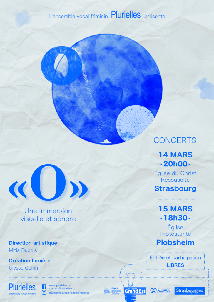“O” est un concert pluridisciplinaire créé par l’ensemble vocal féminin Plurielles en collaboration avec Ulysse Gohin, artiste plasticien et sonore. L’ensemble a choisi l’eau comme thématique centrale du programme et développe le lien universel et intemporel des humains avec l’élément. La scénographie déploie un ensemble d’objets lumineux, motorisés et gelés qui s’allument en synchronisation avec le son, donnant à voir la lumière comme une extension des voix des chanteuses.“O” invite à une immersion poétique dans un espace vivant où interagissent chant et lumière.